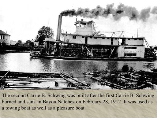 It is highly probable that the last Steamboat at Bayou Pigeon was the Carrie B Schwing in 1927. Mr. Edmond Berthelot personally told me that in 1927 a “pin wheel” boat came and evacuated the residents of Bayou Pigeon during the Great Flood of 1927. The animals rode on the bottom deck and the people on the upper deck.